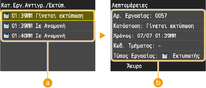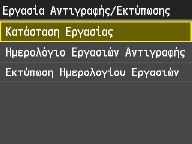 ![]() <Κατ.Εργ.Αντιγρ./Εκτύπ.>Εμφανίζει μια λίστα εγγράφων που βρίσκονται σε επεξεργασία, αντιγράφονται ή περιμένουν να υποβληθούν σε επεξεργασία.