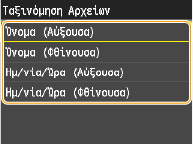Μπορείτε να καθορίσετε μια ρύθμιση ταξινόμησης, όπως <Όνομα (Αύξουσα)> ή <Ημ/νία/Ώρα (Αύξουσα)>, ως την προεπιλεγμένη ρύθμιση για τη σειρά ταξινόμησης αρχείων.