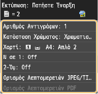 Μπορείτε να εκτυπώσετε δύο ή τέσσερις εικόνες σε ένα μόνο φύλλο. Πατήστε <2 σε 1> ή <4 σε 1>.