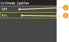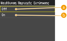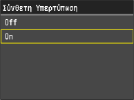 Αυτή η ρύθμιση καθορίζει την κατάσταση για την ειδική επεξεργασία εξομάλυνσης. Η ειδική επεξεργασία εξομάλυνσης διορθώνει την κακή κάθετη ευθυγράμμιση χρώματος, ώστε να εκτυπώνετε ομαλά χαρακτήρες, γραμμές, διαγράμματα, εικόνες (φωτογραφίες) και διαβαθμίσεις που έχουν σκούρα χρώματα.