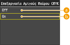 Εάν η επιλογή <Δ/Υ> έχει οριστεί για τη ρύθμιση <Προφίλ Προσομοίωσης CMYK>, η ρύθμιση Επεξεργασία Αμιγούς Μαύρου CMYK δεν εφαρμόζεται.