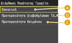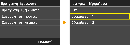 Οι επιλογές <Εφαρμογή σε Γραφικά> και <Εφαρμογή σε Κείμενο> μπορούν να οριστούν μόνο εάν έχει οριστεί η επιλογή <Εξομάλυνση 1> ή <Εξομάλυνση 2> για την Προηγμένη Εξομάλυνση.
