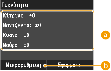 Γίνεται ακριβής προσαρμογή της πυκνότητας εκτύπωσης σε κάθε χρώμα από <Κίτρινο>, <Μαντζέντα>, <Κυανό> και <Μαύρο>.