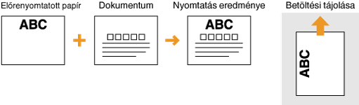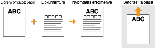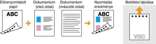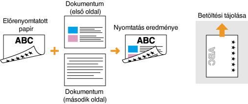 A <Papíradagolási mód váltása> beállításHa felváltva nyomtat egy- és kétoldalasan az előnyomott papírokra, akkor minden váltáskor módosítania kell a nyomtatandó oldalt. Ha viszont a <Papíradagolási mód váltása> beállítás a <Nyomtatott oldal prioritása> értékre van állítva, akkor a kétoldalas nyomtatásnál a fejléces papír behelyezésekor alkalmazott helyzet használható egyoldalas nyomtatáshoz is. Ez a beállítás különösen hasznos, ha gyakran kell egy- és kétoldalas nyomatot is készítenie. Papíradagolási mód váltása