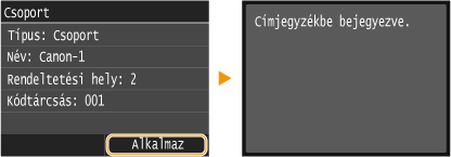 Ismételje meg a 9. és 10. lépést mindaddig, amíg minden bejegyezni kívánt rendeltetési helyet hozzá nem adott a csoporthoz, majd érintse meg az <Alkalmaz> gombot.