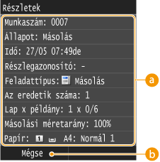A példányszámot, a beállításokat és más adatokat jelenít meg. Ha a másolás megszakítása nélkül szeretné ellenőrizni az adatokat, akkor a