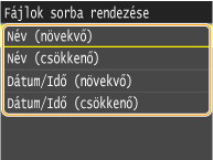 Ha a <Dátum/Idő (növekvő)> vagy a <Dátum/Idő (csökkenő)> lehetőséget választja, akkor a készülék a fájlok módosítási dátuma és időpontja szerint rendezi sorba a fájlokat.