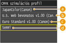 Ha nem a <Semmi> lehetőség van kiválasztva a <CMYK szimulációs profil> beállításnál, a készülék nem alkalmaz felülnyomtatást.