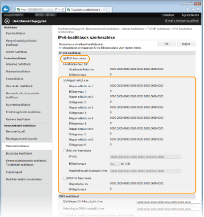 A kezelőpanel használatávalAz IPv6-beállítások a <Menü> gombbal is elérhetők. IPv6-beállítások