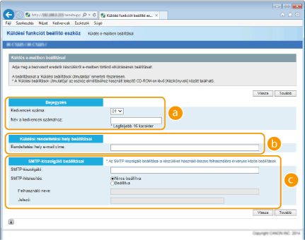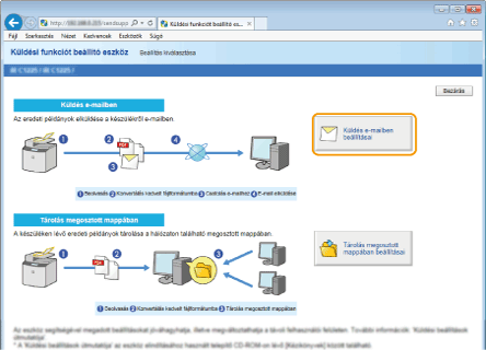 Ha a Küldési-Funkció Beállító Eszköz helyett a Távoli felhasználói felületet használja, akkor részletesebb beállításokat adhat meg (Speciális e-mail beállítások konfigurálása). A Küldés-Funkció Beállító Eszköz azoknak a felhasználóknak jelent segítséget, akik minél egyszerűbben szeretnék elvégezni a beállítást.