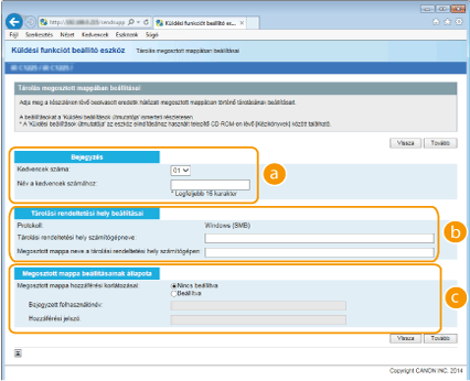 A megosztott mappa hozzáférési korlátozásaival egyezően kattintson a [Nincs Beállítva] vagy a [Beállítás] választógombra. Ha a [Beállítás] lehetőséget választja, akkor adja meg a felhasználónevet a [Regisztrált Felhasználónév], illetve a jelszót a [Jelszó Hozzáféréshez] szövegmezőben.