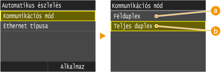 <Félduplex> vagy <Teljes duplex> elemet.![]() <Félduplex>Felváltva küldi és fogadja a kommunikációs adatokat. Akkor válassza, ha a készülék félduplex módon kommunikáló hálózati eszközhöz van csatlakoztatva.