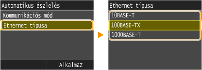 <10BASE-T>, <100BASE-TX> vagy <1000BASE-T> elemet.![]() ![]() Az <1000BASE-T> csak akkor választható, ha a <Teljes duplex> lehetőséget választja a 2. lépésben.