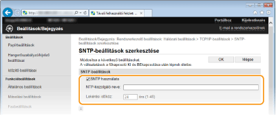 Az NTP/SNTP-kiszolgálóval folytatott kommunikáció teszteléseTesztelheti, hogy a készülék kommunikál-e a bejegyzett időkiszolgálóval az SNTP protokollon keresztül. Nyissa meg a [Beállítások/Bejegyzés]