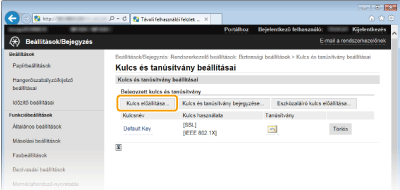 Ha egy kulcspárt használja valamilyen funkció, például a [Kulcs használata] mezőben a „TLS” vagy az „IEEE 802.1X” lehetőség van kiválasztva, akkor nem törölhető. Ebben az esetben a kulcspár törlése előtt ki kell kapcsolni a funkciót, vagy le kell cserélnie a kulcspárt.