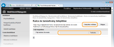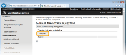 A készülékkel használni kívánt kulcspárok és digitális tanúsítványok hitelesítésszolgáltatóktól szerezhetők be. A fájlokat mentheti a számítógépre, majd bejegyezheti a Távoli felhasználói felülettel. Győződjön meg róla, hogy a kulcspár és a tanúsítvány megfelel a készülék által támasztott követelményeknek (