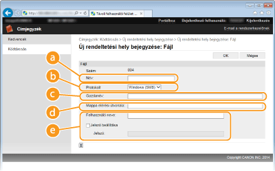 [FTP]: Válassza ezt a lehetőséget fájlkiszolgáló használatához. [Gazdanév]Megosztott mappa használatához adja meg a megosztott mappa elérési útját (legfeljebb 120 karakterben) vagy IP-címét (például: \\swan\share vagy \\192.168.2.100\share).