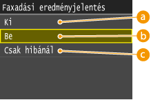 Ha a <Be> vagy a <Csak hibánál> lehetőséget választja a <Faxadási eredményjelentés> beállításnál, a faxolt dokumentum egy részét is kinyomtathatja a jelentésre. Állítsa a <Adási képpel> beállítást a <Be> értékre.