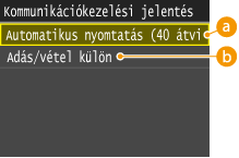 Ha külön szeretné kinyomtatni a küldési és a fogadási jelentést, válassza a <Be> beállítást. Ha egy lapra szeretné nyomtatni a két jelentést, válassza a <Ki> beállítást.