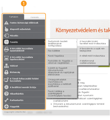 Az e-Kézikönyv tartalomjegyzékét jeleníti meg.