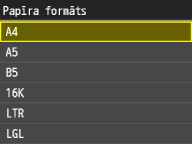 Ja iepriekš redzamais ekrāns netiek rādīts, ievietojot papīruJa universālajā teknē vienmēr ievietojat vienu un to pašu papīra formātu, varat izlaist papīra iestatīšanas darbības, reģistrējot papīra formātu un veidu kā noklusējuma iestatījumu. Reģistrējot noklusējuma iestatījumu, iepriekš redzamais ekrāns netiek parādīts. Lai parādītu ekrānu, iestatījumam <Reģistrēt noklus. iestatījumus> (Noklusējuma papīra iestatījumu reģistrēšana universālajai teknei) izvēlieties vērtību <Izsl.>.