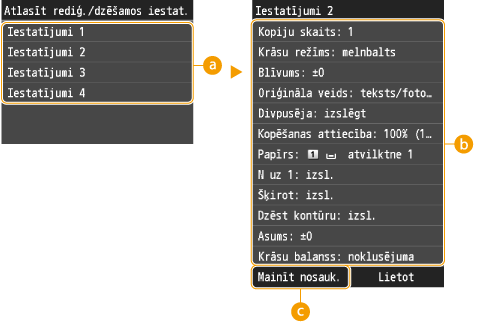 Var reģistrēt līdz pat četrām bieži izmantotām kopēšanas iestatījumu kombinācijām. Ja varēsit vienkārši atlasīt jau reģistrētu iestatījumu kombināciju, samazināsit nepieciešamību ik reizi kopējot konfigurēt tos pašus iestatījumus, piemēram, ja bieži kā kopiju skaitu iestatāt skaitli 5, iestatiet opciju <Dzēst kontūru> kā <Iesl.> un kopējot palieliniet asumu Iestatījumu kombinācijas varat reģistrēt ar jebkādu nosaukumu.