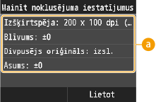 Noklusējuma iestatījumi ir tie iestatījumi, kas tiek parādīti ikreiz, kad ieslēdzat iekārtu vai nospiežat