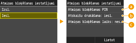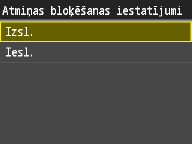 Lai atmiņā glabātu saņemtos dokumentus, iestatiet opciju <Atmiņas bloķēšanas iestatījumi> kā <Iesl.>. Varat arī norādīt papildu iestatījumus, piemēram, drošības iestatījumu ar paroli, kas nepieciešama funkcijas atbloķēšanai, un laika iestatījumu, kurā varat norādīt dienas laiku, kad saņemtie dokumenti ir jāglabā atmiņā.