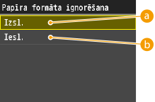 Izvēlieties, vai jāpārslēdzas no drukāšanas uz A4 formāta papīra uz drukāšanu uz Letter papīra formāta papīra un pretēji, ja ir ievietots tikai viena formāta papīrs. Piem., ja drukājat Letter formāta dokumentu, bet iekārtā ir ievietots tikai A4 formāta papīrs, tad iekārta drukās dokumentu uz A4 formāta papīra.