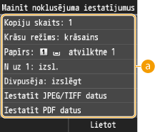Noklusējuma iestatījumi ir tie iestatījumi, kas tiek parādīti ikreiz, kad ieslēdzat iekārtu vai nospiežat
