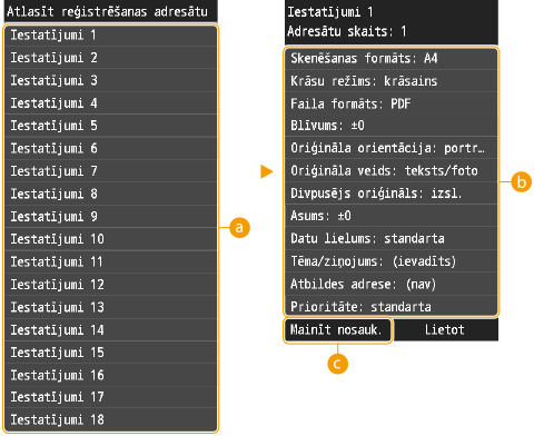 <Izlases iestatījumi> <Rediģēt/dzēst> <Dzēst> pieskarieties pie iestatījumiem, lai rediģētu <Jā>.Ja vēlaties izmantot reģistrētu iestatījumu, pieskarieties pie <Skenēšana>
