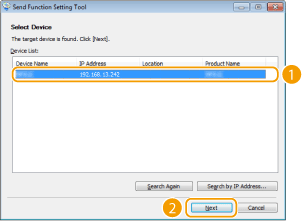 Ja iekārta netiek rādīta opcijā [Device List] (Iekārtu saraksts) Noklikšķiniet uz [Search Again] (Meklēt vēlreiz). Ja problēma joprojām pastāv, noklikšķiniet uz [Search by IP Address] (Meklēt pēc IP adreses), ievadiet iekārtas IP adresi un pēc tam noklikšķiniet uz [OK] (Labi). |