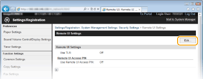 <Sistēmas pārvaldības iestatījumi> <Attālā interfeisa iestatījumi> <Attālā interfeisa piekļuves drošības iestatījumi> <Iesl.> Ievadīt PIN Lietot Ievadīt PIN (Apstiprināt) Lietot.Rīcība Remote UI (Attālais lietotāja interfeiss) iestatījumu atjaunošanas gadījumāŠādā gadījumā tiek atjaunots arī Remote UI (Attālais lietotāja interfeiss) PIN. Pēc atjaunošanas atiestatiet PIN. Izvēlnes inicializēšana