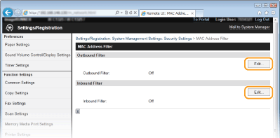![]() Pārbaudiet, vai dati ir ievadīti pareizi Ja MAC adreses ir ievadītas nepareizi, iespējams, nevarēsit piekļūt iekārtai, izmantojot utilītprogrammu Remote UI (Attālais lietotāja interfeiss). Šādā gadījumā <MAC Address Filter> ir jāiestata kā <Izsl.>. MAC adrešu filtrs