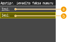 Varat iestatīt, lai iekārta jautātu lietotājam norādīt faksa numuru divreiz, ja tas tiek ievadīts, izmantojot ciparu taustiņus. Šādi varat samazināt risku, ka fakss tiek nosūtīts uz nepareizu numuru ievades kļūdu dēļ.