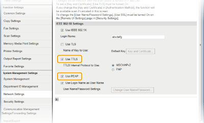 Nepieciešamie iestatījumi ir gandrīz tādi paši kā TTLS iestatījumi. MS-CHAPv2 tiek izmantots kā iekšējs protokols. Pirms šīs autentifikācijas metodes konfigurēšanas iespējojiet utilītas Remote UI (Attālais lietotāja interfeiss) TLS (