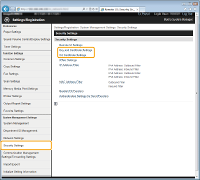 [Key and Certificate Settings] (atslēgu pāriem) vai [CA Certificate Settings] (CA sertifikātiem).