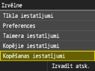 Visi kopēšanas iestatījumi ir ar īsu aprakstu. Noklusējuma iestatījumi ir atzīmēti ar krustiņu (