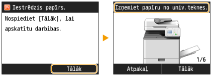 Papīrs, iespējams, ir iestrēdzis citā vietā, nevis displejā parādītajā papīra atvilktnē. Izvelciet katru atvilktni un pārbaudiet, vai tajā nav iestrēdzis papīrs.