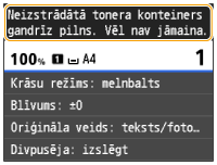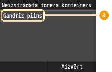 Kad izlietotā tonera konteiners ir gandrīz pilns, tiek parādīts ziņojums. Displejā varat arī pārbaudīt, cik daudz izlietotā tonera konteinerā vēl var ietilpt.