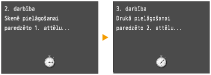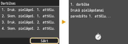 Tiek skenēts pielāgošanas attēls, un tiek sākta pielāgošana. Pēc aptuveni 10 sekundēm tiek izdrukāts otrs pielāgošanas attēls.