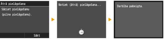 Šis pielāgojums uztur optimizēto stāvokli, kāds tika iegūts, izmantojot iespēju <Pilna pielāgošana>. Ņemiet vērā, ka šo pielāgošanu nevarat veikt, ja tiek izpildītas dažas funkcijas, ieskaitot skenēšanu un drukāšanu. Ja šī pielāgojuma rezultāts nav pietiekams, izmantojiet iespēju <Pilna pielāgošana>. Šis pielāgojums, iespējams, tiek veikts automātiski pēc tonera kasetnes nomaiņas.