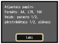 Pārbaudiet, vai iekārtā ir ievietots ekrānā parādītais papīra formāts un veids, un pieskarieties pie <Labi>.