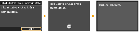 Drukas krāsu neatbilstība ir saistīta ar krāsu pozīcijas maiņu, kas var rasties, ja vienu attēlu drukā ar vairākām tonera kasetnēm. Drukas krāsu neatbilstības dēļ izdrukas var izskatīties izplūdušas. Ja ir drukas krāsu neatbilstība, veiciet tālāk norādītās darbības. Šis pielāgojums dažreiz tiek veikts automātiski, piemēram, kad tiek mainītas tonera kasetnes.