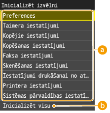 Informāciju par iestatījumu <Tīkla iestatījumi> un <Sistēmas pārvaldības iest.> inicializēšanu skatiet sadaļā Sistēmas pārvaldības iestatījumu inicializēšana.