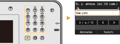 Skaičių mygtukus galite naudoti tik nurodydami pirmąjį adresatą. Jei norite nurodyti papildomus adresatus, naudokite adresų knygelę arba LDAP serverį. Norėdami nurodyti adresatus kaip kopijos ar nematomos kopijos adresatus, turite naudoti adresų knygelę.