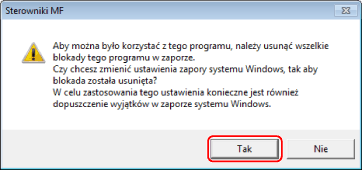 Jeśli podczas instalacji wyświetlone zostanie poniższe okno dialogowe, wybierz opcję [Tak]. Blokowanie przez Zaporę systemu Windows zostanie wyłączone i będzie można kontynuować instalację.