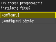 W przypadku dotknięcia opcji <Skonfiguruj później> tryb odbioru zostaje ustawiony na <Autom.>. Aby skonfigurować ustawienia faksu w późniejszym czasie, należy wyświetlić ekran ustawień faksu, naciskając po kolei przyciski <Menu>