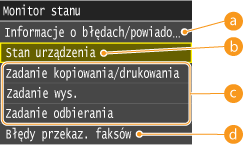 wyświetlony zostaje ekran umożliwiający sprawdzenie statusu drukowanych, wysyłanych lub otrzymywanych dokumentów, a także statusu urządzenia, np. poziomu toneru w zasobnikach lub danych na temat ustawień sieciowych, takich jak ustawienia adresu IP urządzenia.