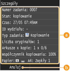 Zostaną wyświetlone: liczba kopii, ustawienia oraz inne informacje. Aby sprawdzić szczegóły kopiowania bez anulowania czynności, naciśnij przycisk